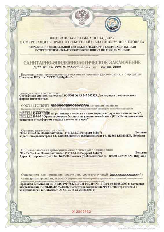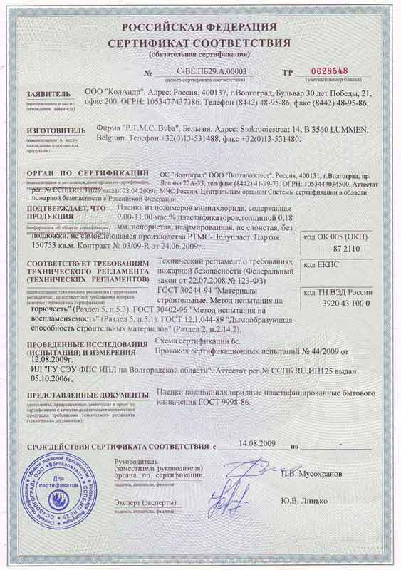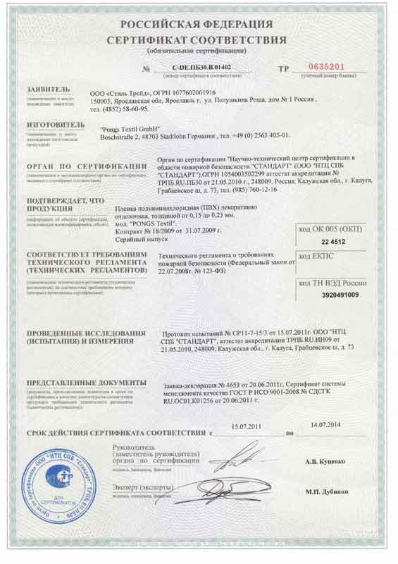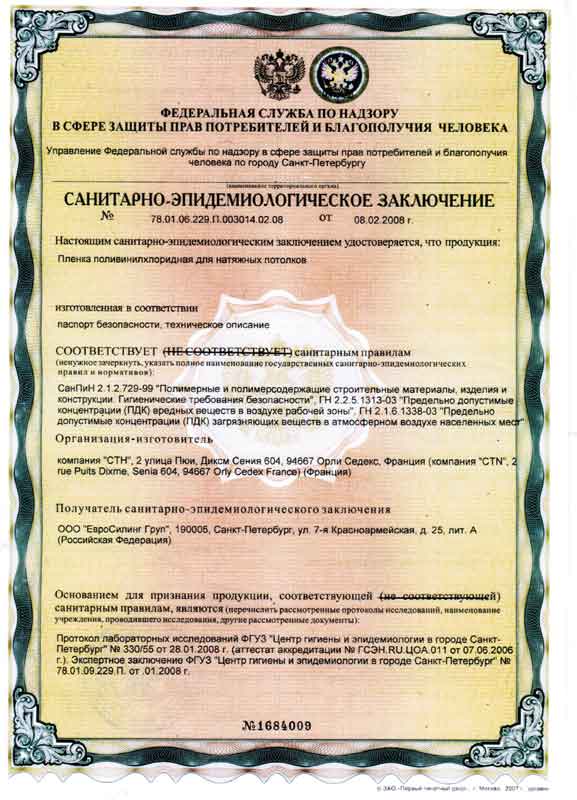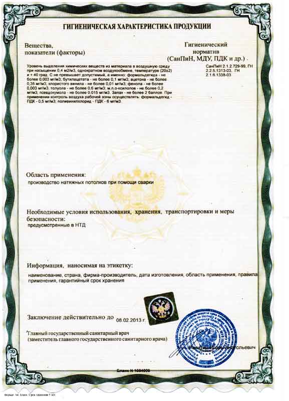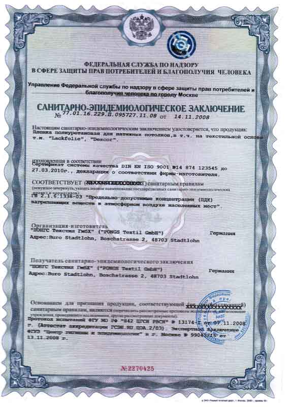 На все материалы, используемые нами при установке натяжных потолков, имеются сертификаты соответствия и пожарной безопасности, что гарантирует долголетнюю службу натяжного потолка.